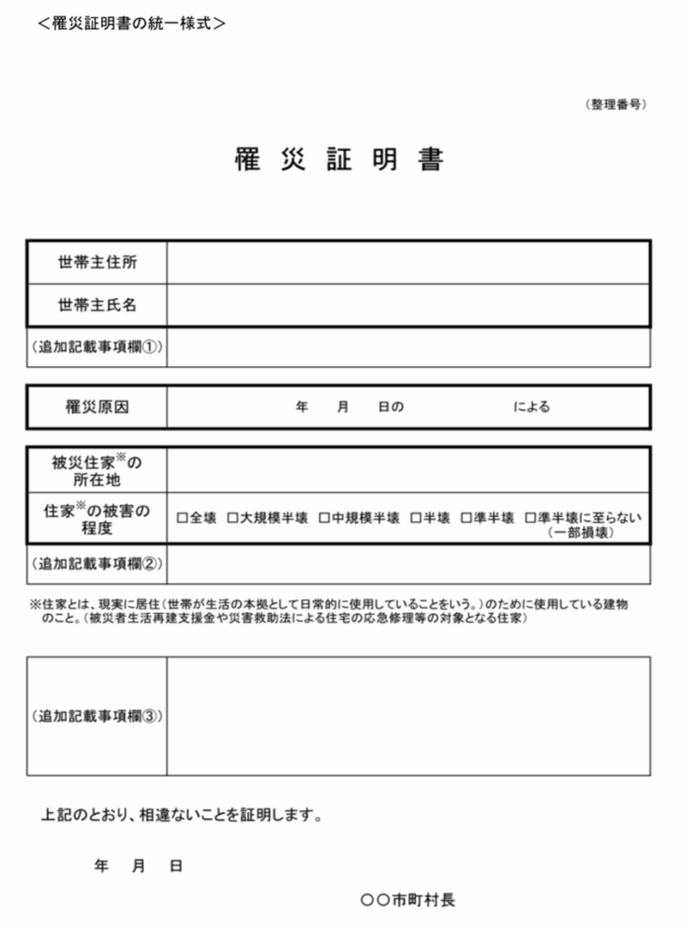 証明書の様式が大きく異なるために、被災自治体での罹災証明書の迅速な交付の支障となっていることから、様式の統一に対する要望が出ていたことを踏まえ、罹災証明書の統一様式を提示しています(「罹災証明書の様式の統一化について」(令和2年3月30日付け府政防第737号内閣府政策統括官(防災担当))通知)。