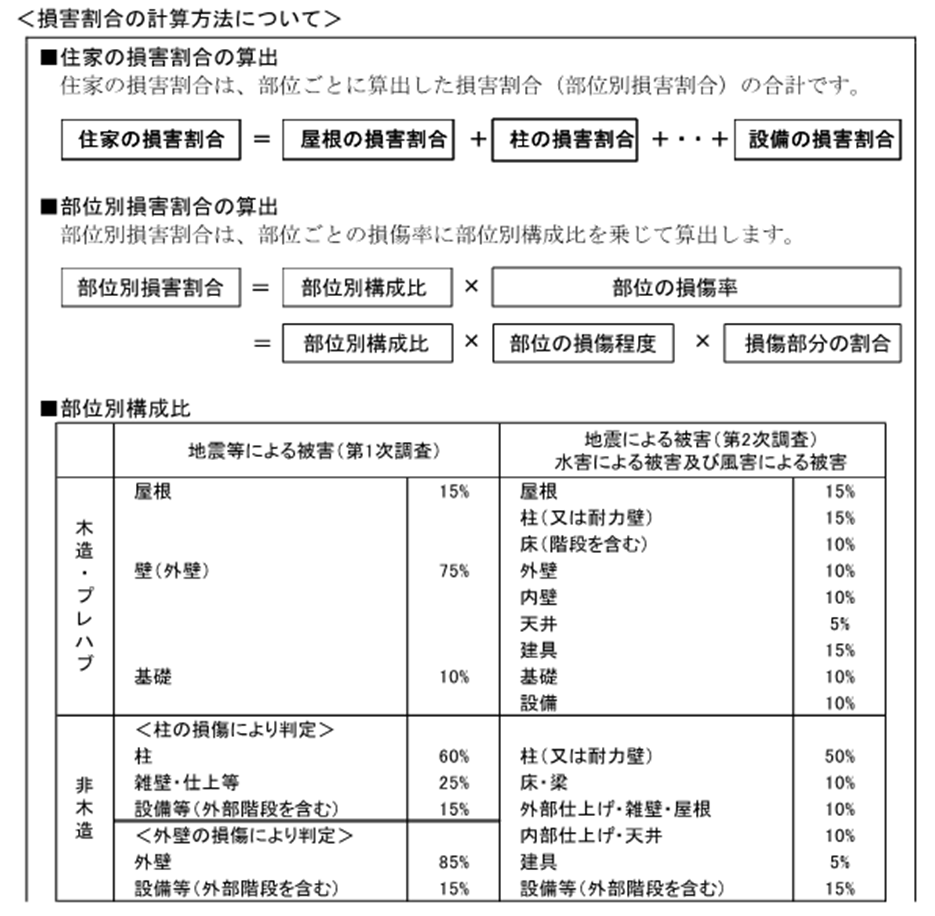 に、原則として、部位(基礎、柱等)別の損害割合を算出し、それらを合計し