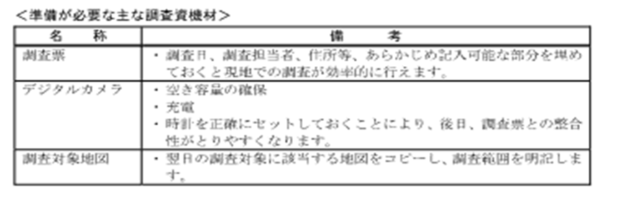 調査対象について、a)地図情報との照合を行い、b)聞き取り調査、